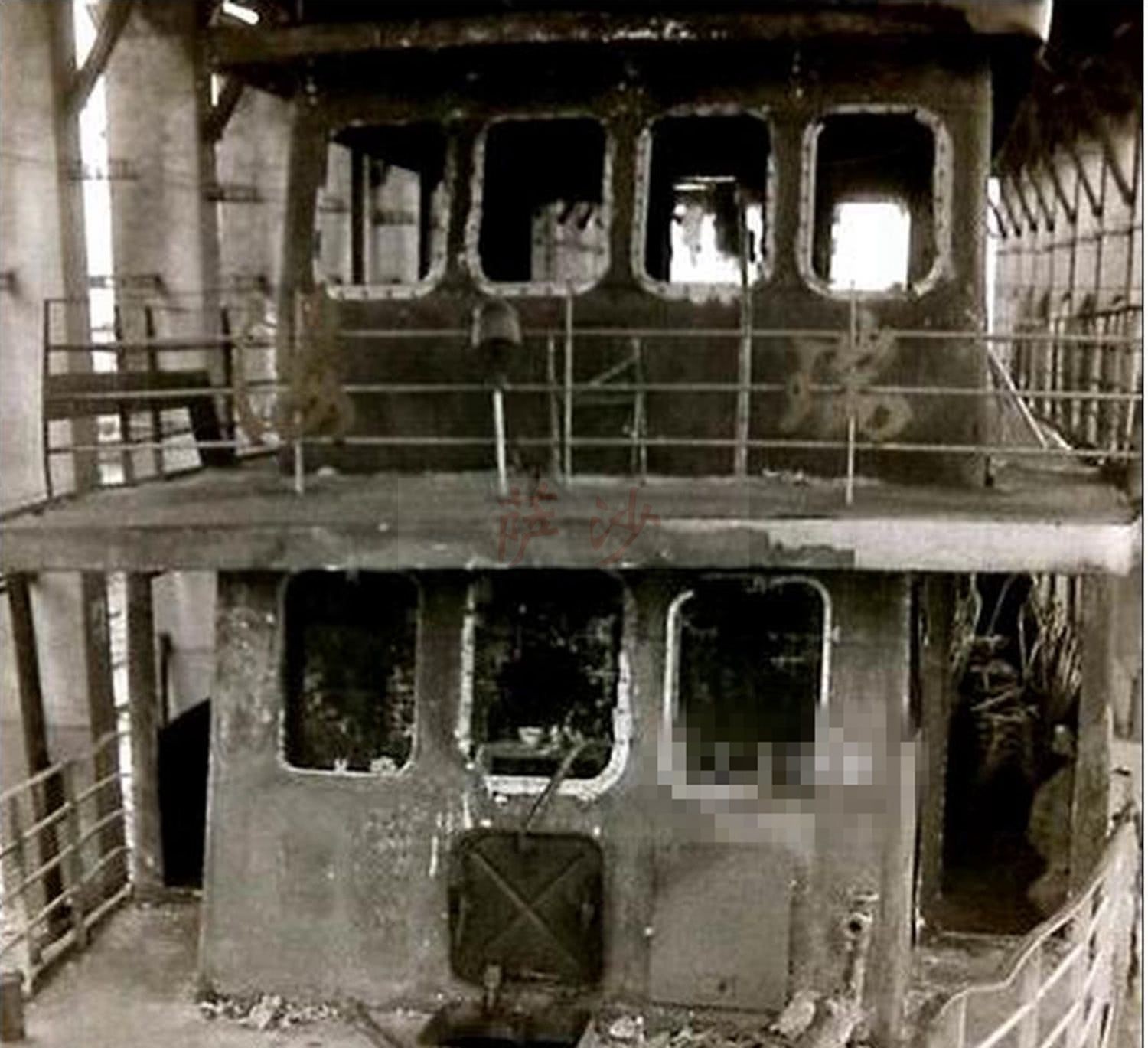(1)遗体下半部没有碳化,而上半部碳化明显,是因为32个人站立在水中,根据遗体碳化痕迹细节推断,当时储物仓里的水,有1.1米左右。