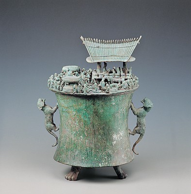 (一)青铜器:云南在公元前七世纪就已存在了一种独具风格的青铜文化。当时的古滇国民族很少受中原传统礼教的束缚,无论艺术构思和表现手法,都显得更加开放和富有创造性。尤其是青铜器上的装饰图案,多为大自然中的动物、植物图像和人们日常生活中的典型情节,栩栩如生。古滇国青铜器经常出现的就有四十余种,大到虎豹、小至蜜蜂甲虫,刻画得十分精致逼真。古滇青铜器更多的是以反映滇王国社会生活为主题内容的贮贝器和铜扣饰,明显具有滇王国特有的地域文化特征。