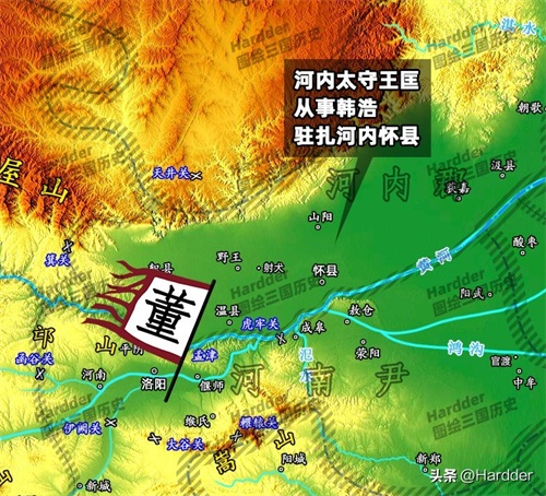 袁绍、王匡屯河内,河内指洛阳北的河内郡,此处的具体地点史书并没有记载,河内郡的治所是怀县,也就是河内太守王匡的办公地点,所以袁绍、王匡驻扎的具体地点选在怀县比较合适。袁绍的行动路线参看前文上任渤海太守的路线,此处不赘述。