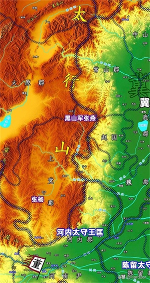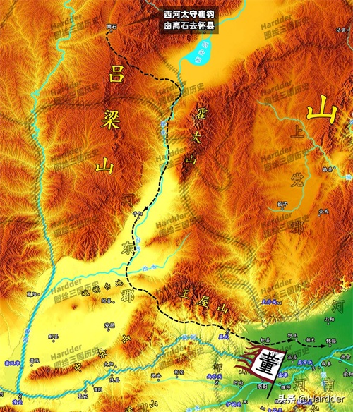西河太守崔钧与袁绍共同起兵,但是具体过程不详,只能稍微看一下从西河去河内的路线,西河郡治为离石县,从离石去往河内怀县的路线是东行经上党郡前往,离石之西的黄河水路在此段因为落差很大所以无法行走。