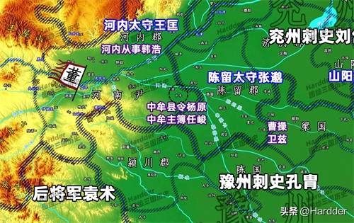上面这一串名单中,除去袁术之外,都是各州郡的长官,有固定的办公地点,很容易标在地图上,而袁术的官职是后将军,这个官职没有办法体现在地图上,总不能把袁术放在洛阳,袁术从洛阳逃出来后去往南阳郡鲁阳县,此事见前文,所以把袁术放在南阳鲁县比较合适。