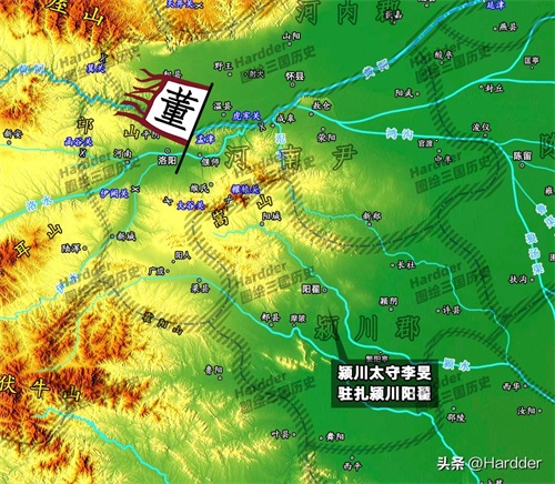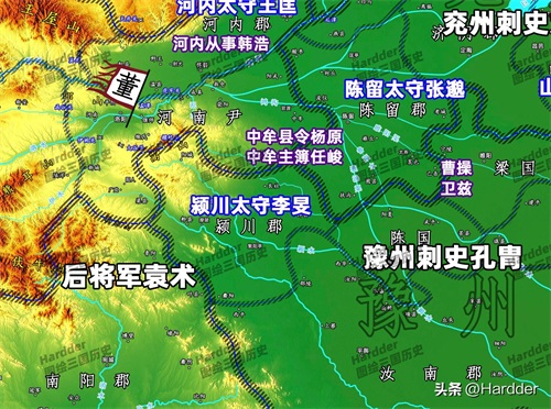 孔伷驻扎颍川郡,颍川郡位于洛阳东南,阻挡着洛阳的出口之一轘辕关,此处仍然没有记载具体在何处,我将其放在颍川郡的治所阳翟县。