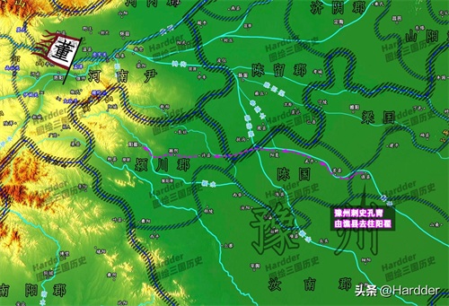 孔伷起兵后是从谯县去往阳翟,路线猜测如图。