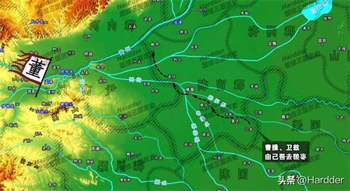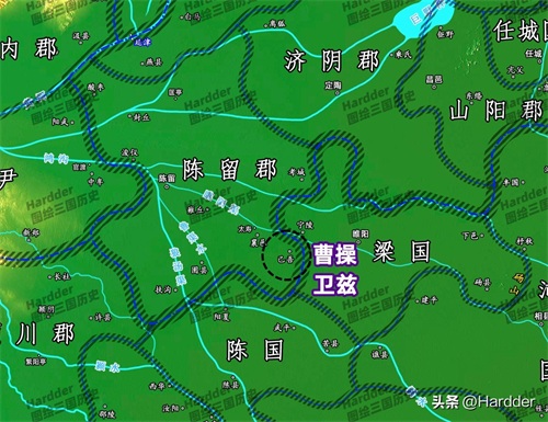曹操在陈留郡己吾县起兵,去往酸枣与众人联合,路线如图,此行中同样有卫兹的参与。