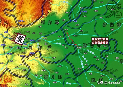 张邈为陈留太守,酸枣就位于陈留郡境内,距离很近,路线如下。