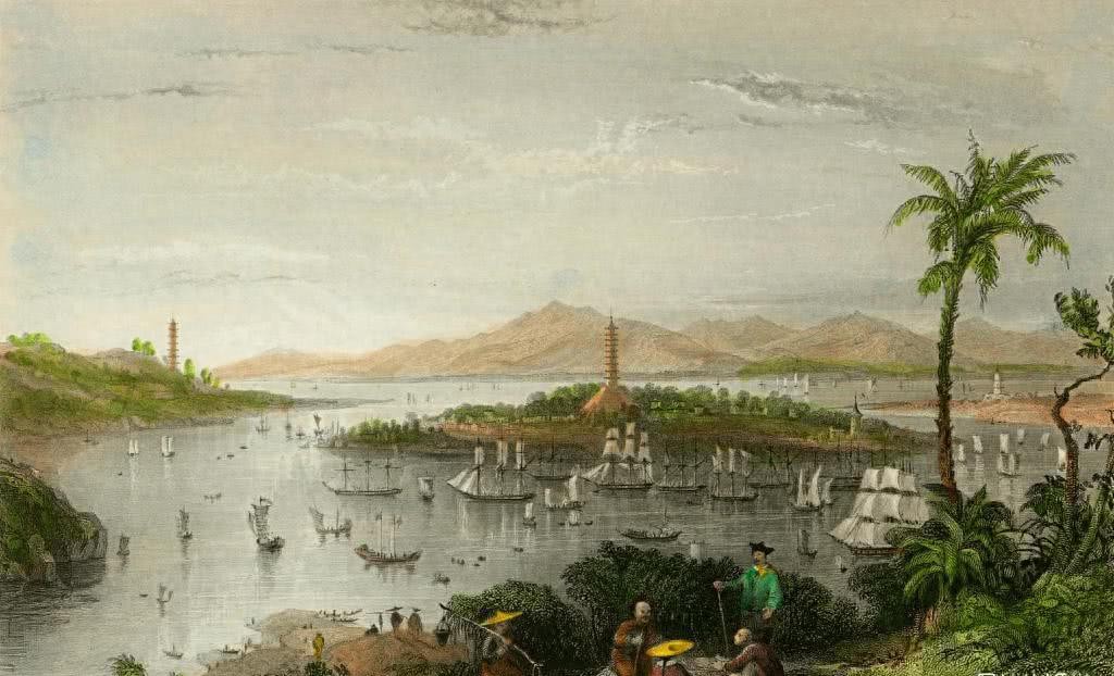 【清政府与法国签订《黄埔条约》】1844年8月14日,法国公使来到澳门,并开来8艘兵船,以显示其武力。采取恫吓和讹诈等手段提出援引英、美先例订立条约的要求。10月24日,清钦差大臣耆英和法国公使拉萼尼分别代表清政府与法国在广州黄埔签订《黄埔条约》,这是法国侵略中国的第一个不平等条约。图为19世纪英国画家绘制的彩色铜版画,描绘广东珠江下游的黄埔岛,中法两国在此签署《黄埔条约》。秦风老照片馆/视觉中国