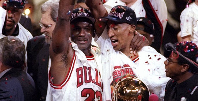 历史最佳二人组合,应该是芝加哥公牛的“飞人”乔丹与“野牛”皮篷,他们配合天衣无缝,时间进放1997年NBA总决赛,他们的对手是犹他爵士队,也有一个非常优秀的双人组,那便是“邮差”卡尔.马龙和“绅士”约翰.斯托克顿的搭档。