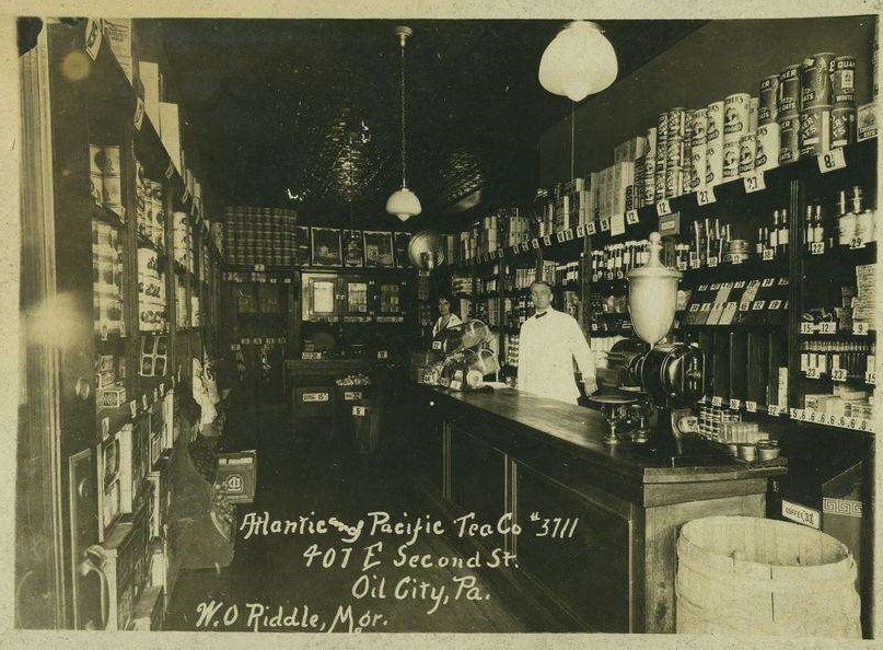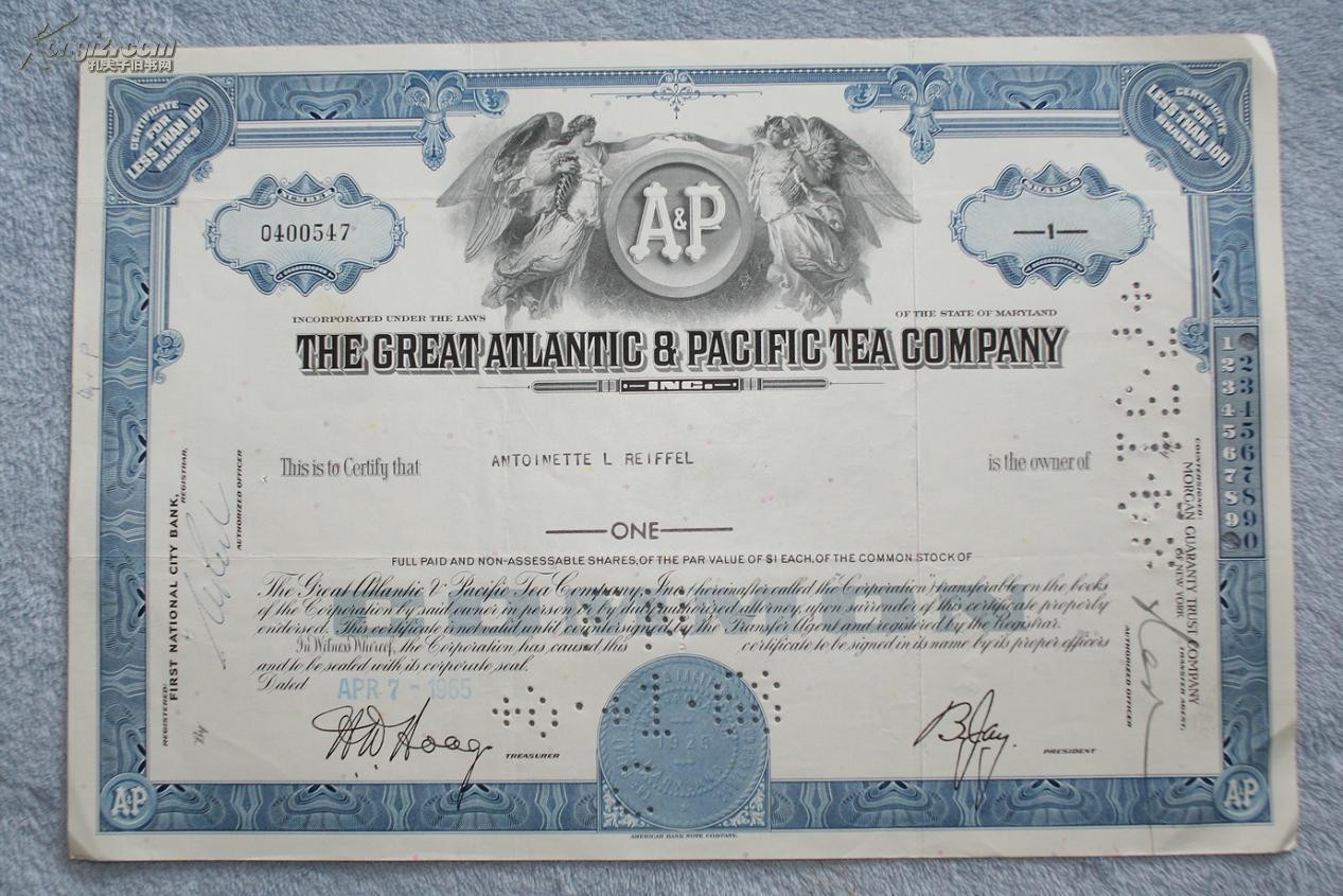 是1859年乔治·F吉尔曼和乔治·亭廷顿哈特福特在纽约创办的大美国茶叶公司。在短短6年的时间里,便已发展到了26家正规连锁店。全部集中在百老汇大街和华尔街一带,全部经销茶叶。1869年该公司更名为“大西洋与太平洋茶叶公司"(Great Atlantic & Pacific Tea Co),并开始把它的连锁商店延伸到东北部,越过阿巴拉契亚山,延伸到了更远的地方,到1880年已经发展了100多家分店。