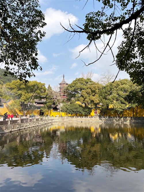 鱼乐池中锦鲤悠然游弋,与佛殿倒影相映成趣,取“鱼乐人亦乐”之意。