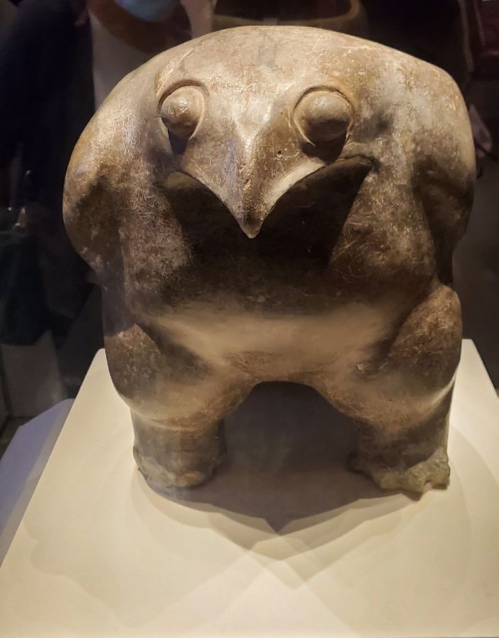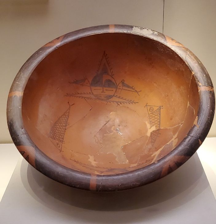 人面鱼纹彩陶盆,距今7000-5000年,出土于西安半坡,仰韶文化的代表文物之一,国家一级文物,禁止出境展览。它的作用不仅仅是一个盆,而是一种特殊的葬具,多作为儿童瓮棺的棺盖来使用。鱼,出现在很多仰韶文化的陶器上面,说明鱼在半坡人生活中占据极其重要的地位,可能是一种图腾,也可能是一种繁衍崇拜,当然,鱼也是半坡人的食物。陶盆里,两条鱼相互追逐,最终游弋到人像的嘴边,个人的观点是最简单的寓意:食物,算是一种图文化的祭品。还有两条是游弋到人像的耳边,像是在超度灵魂,头顶也是鱼的形状,总之,这是活着的人对死亡之人一种祈福。