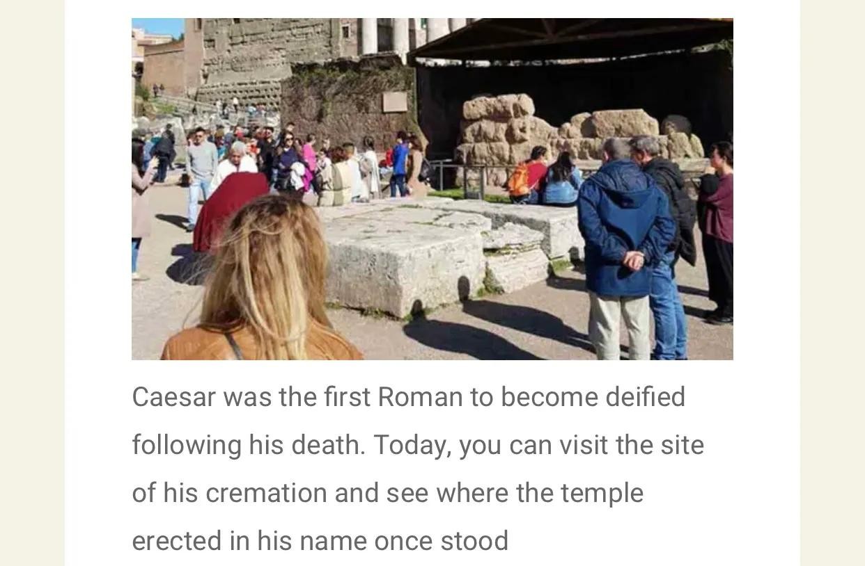 凯撒是第一个在他死后被神化的罗马人。 今天,您可以参观他的火葬地点,看看曾经以他的名字建造的寺庙的所在地。