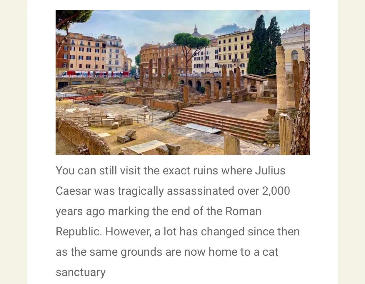 您仍然可以参观 2000 多年前凯撒大帝惨遭暗杀的确切遗址,标志着罗马共和国的终结。 然而,从那以后发生了很多变化,因为现在同样的场地是猫保护区的所在地。