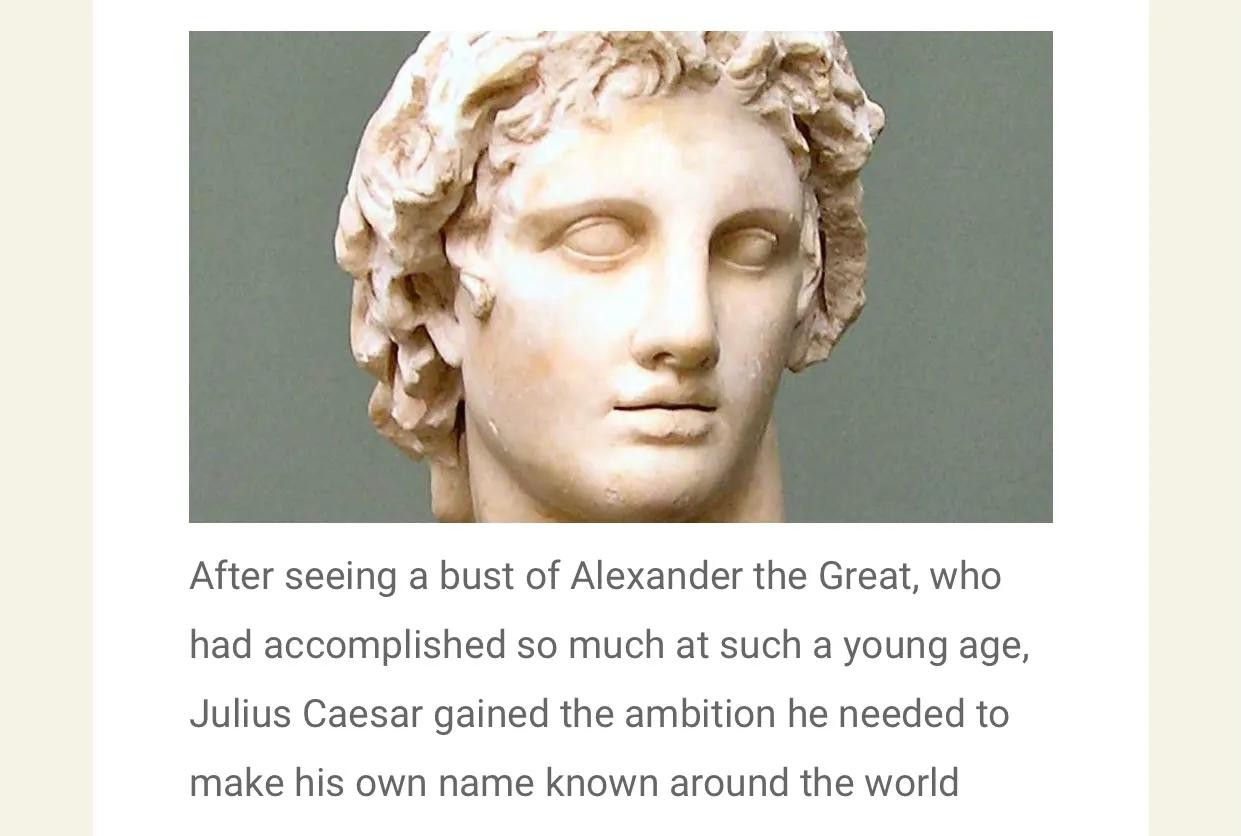 朱利叶斯·凯撒 (Julius Caesar) 在看到亚历山大大帝 (Alexander the Great) 的半身像后,他在如此年轻的时候就取得了如此大的成就,他获得了让自己的名字享誉全球的雄心。