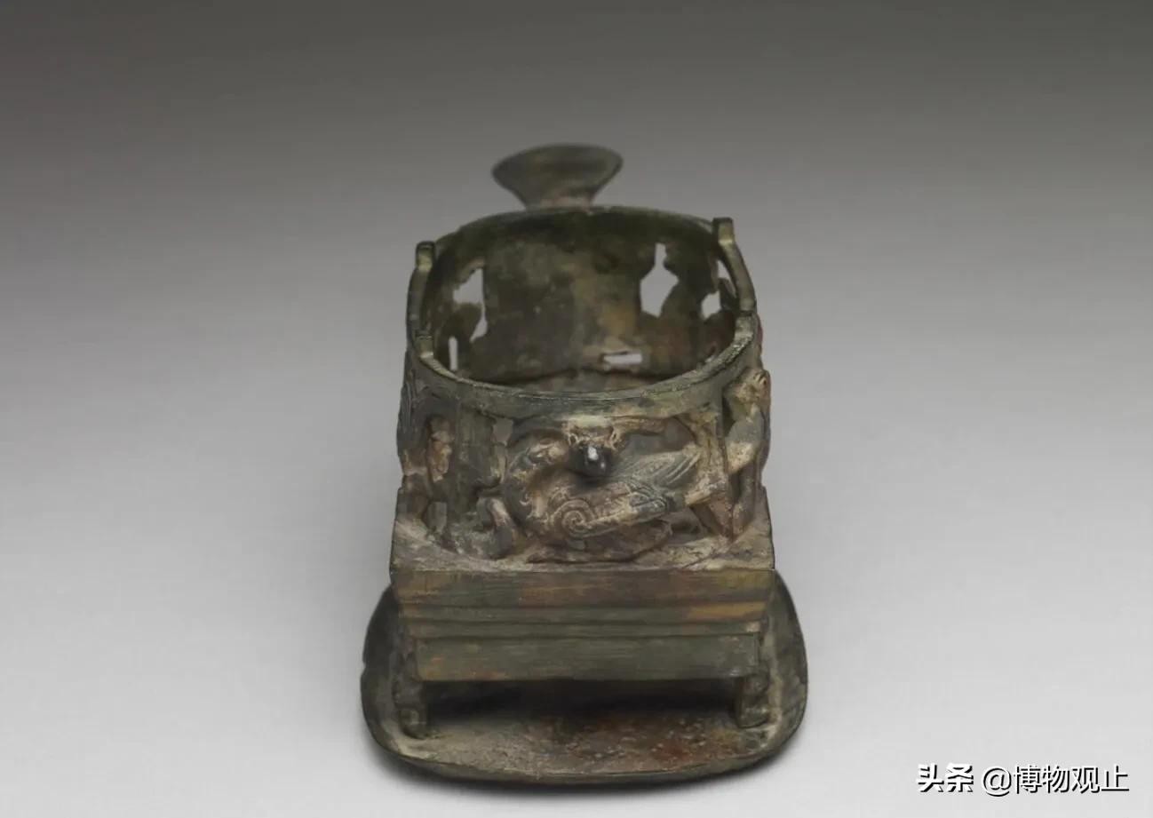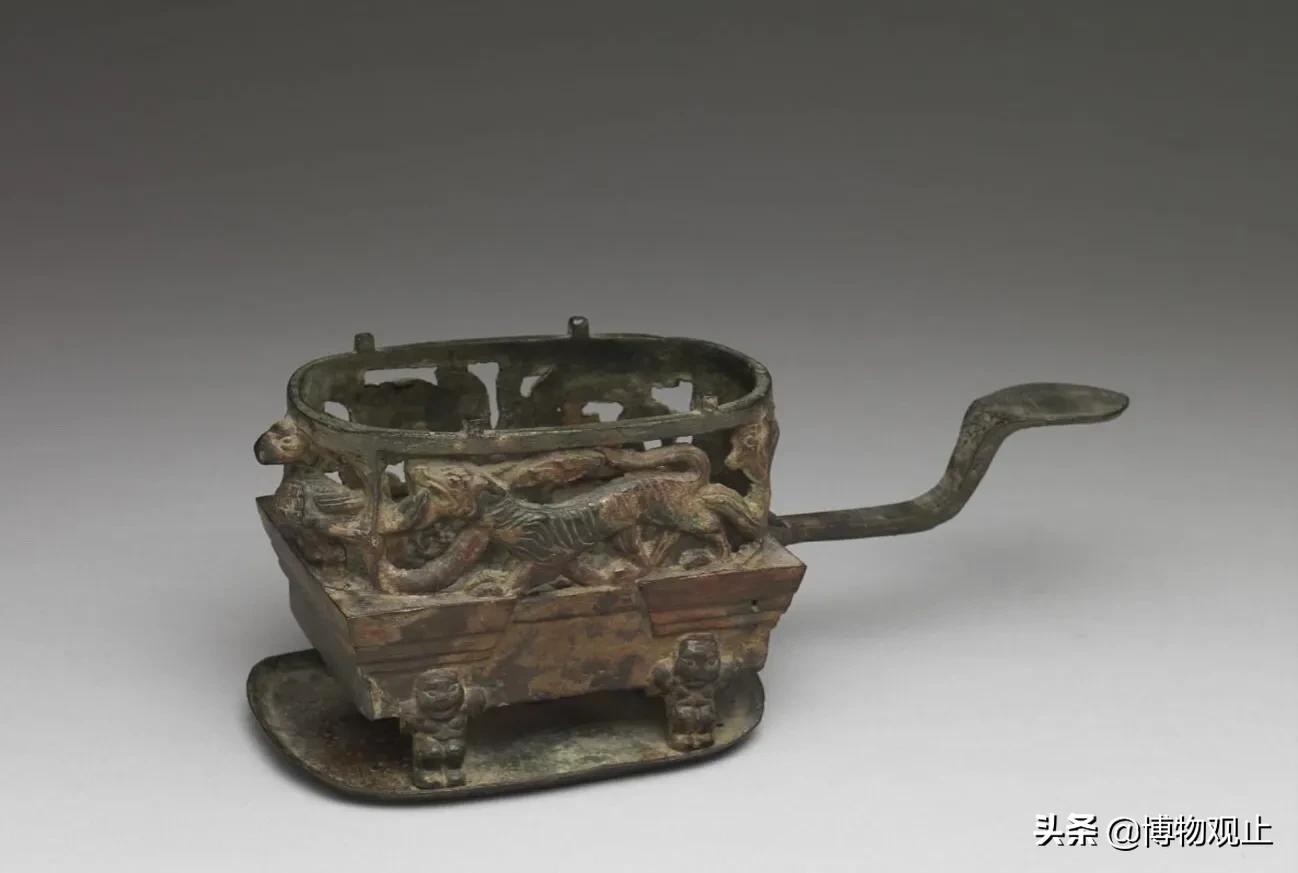 这件汉代的四神兽染炉,据说是用来温酒的食器。它的炉身上装饰有青龙、白虎、朱雀、玄武的神兽图案。图案的相对位置,说明四神和方位的配对,在汉代便已约定俗成。