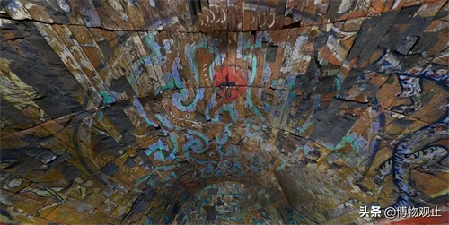这组西汉的彩色壁画,是已知最早的星宿神形图。它位于一座墓葬的主墓室顶部,是1987年在西安交大二村附属小学内发现的。壁画外径达2.7m,外圈分布着四神及八星宿的图示,内圈描绘太阳、月亮、祥云丶仙鹤。