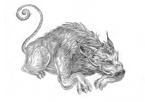 当康,又称作牙豚,古代寓意五谷丰登的吉祥瑞兽之一,传说在太平盛世才会出现。被《山海经》描述为形状如猪,长有两只大耳,口中伸出四肢长牙。现代人将古典书籍的描述与现存的物种对比后基本确定了生存在非洲地区的疣猪就是当康的原型动物。