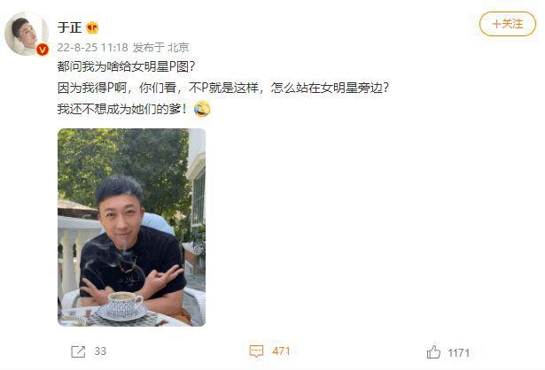 网易娱乐 8 月 25 日报道 25 日,于正在社交平台上晒出自己对着镜头双手比耶的照片回应给女明星 P 图一事,他表示:" 都问我为啥给女明星 P 图?因为我得 P 啊,你们看,不 P 就是这样,怎么站在女明星旁边?我还不想成为她们的爹!" 此前,于正曾晒出与孔雪儿、吴宣仪的合照,照片中所使用的美颜滤镜引发了不少网友的吐槽。