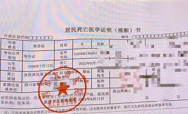 同时,账号还晒出了周思廷的死亡证明书,确定她的死亡原因是急性消化道大出血导致的,希望大家不要胡乱猜测,更不要造谣、诋毁一位已经去世的小姑娘。