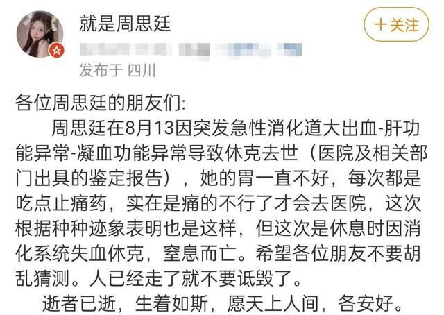 此事曝光之后,已经停更一个多月的周思廷的社交账号突然更新,称周思廷于 8 月 13 日突发急性消化道大出血而休克,不幸窒息而亡。
