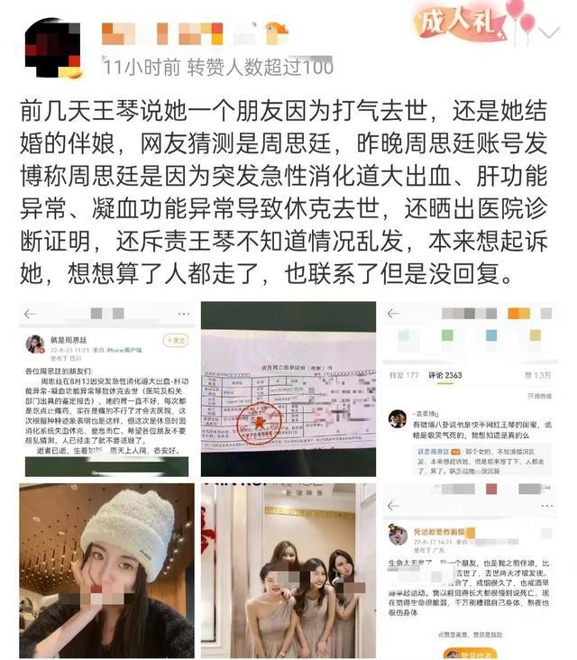 事情的起因是网红王琴发文称自己的朋友因为打气去世了,去世两天才被发现, 她透露这位朋友曾是她的伴娘,因此有网友猜到了周思廷身上。