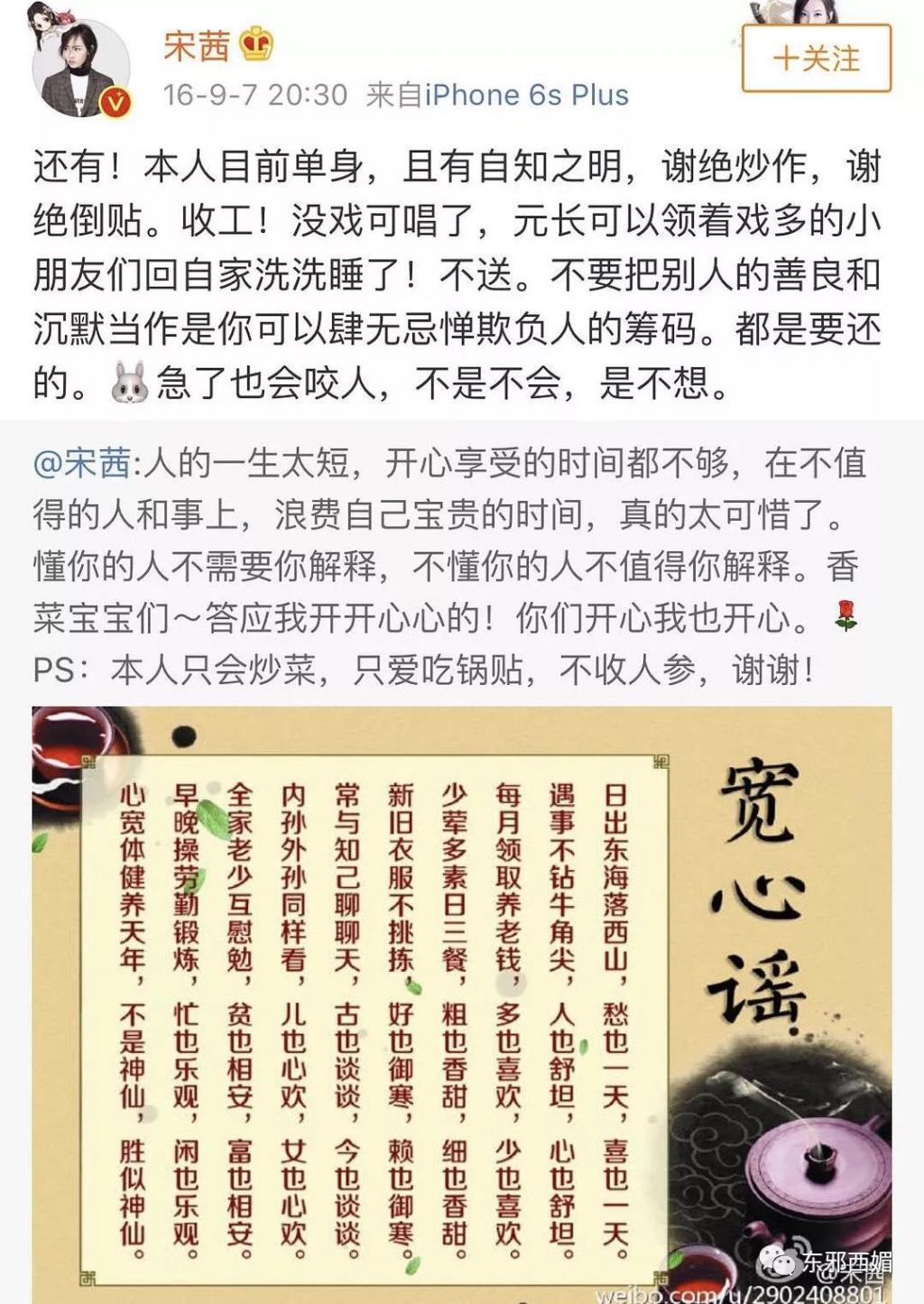 宋茜似乎被气得不轻,第二天再次发文,强调自己是单身,还借杨洋经纪人刘元的名字内涵了一把:"元长可以领着戏多的小朋友回家洗洗睡了。"