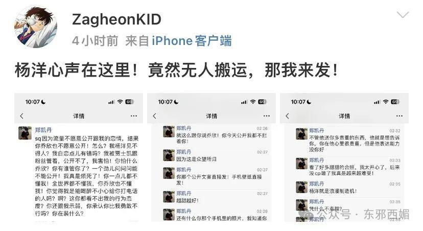 她从昨晚开始,在朋友圈连续输出关于杨洋和乔欣、张天爱等人的N条信息,被搬运到公众平台上了热搜后,今天她又转换阵地到微博上继续输出。