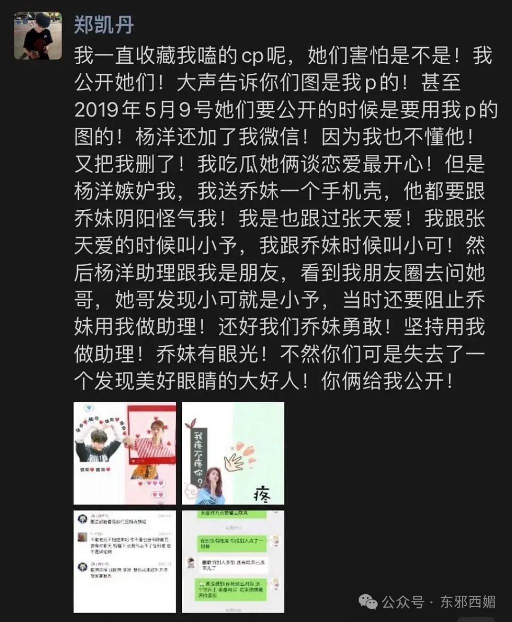 突然跳出来爆料的这位,朋友圈里自称当过乔欣和张天爱的助理。