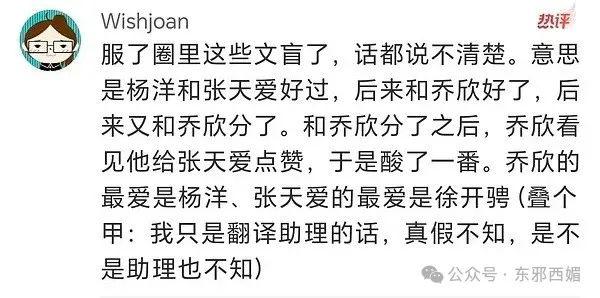 从聊天来看,疑似乔欣和杨洋分手后,看到他和"张小姐"互相点赞以为他们复合,杨否认后,乔对他说:伤我最深的是你。