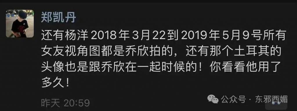 前助理称,杨洋2025年3月22日到2025年5月9日所有女友视角图都是乔欣拍的,还有他挂了很久的土耳其头像,也是跟乔欣在一起的时期拍的。