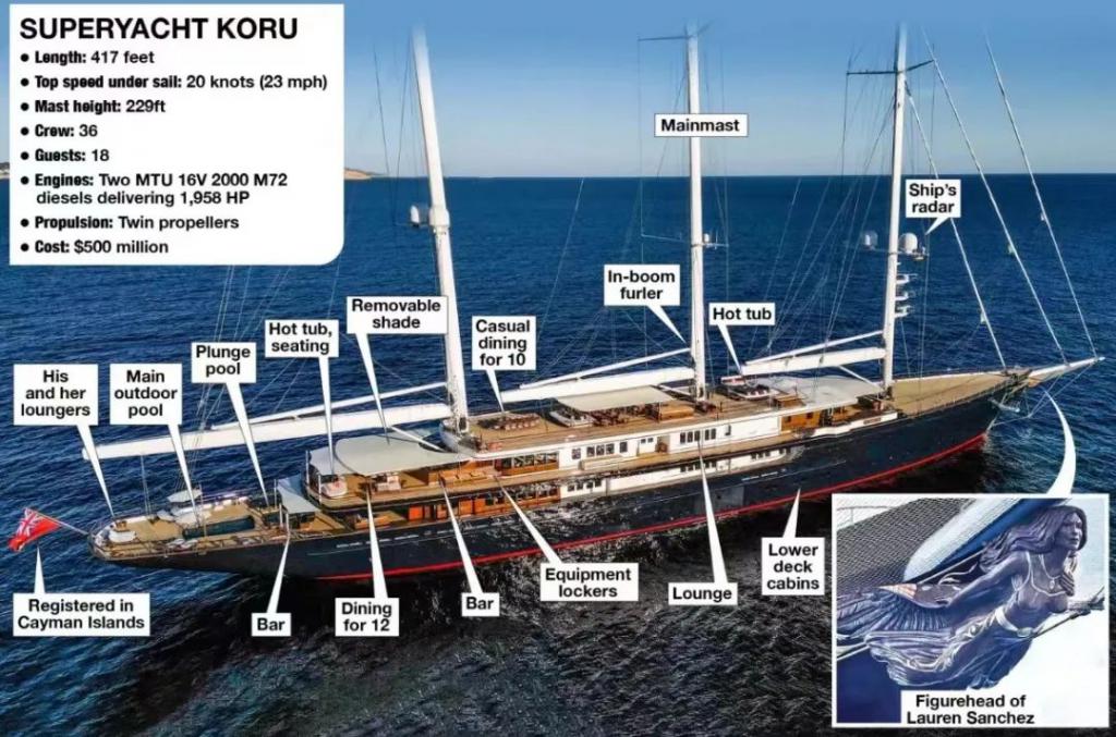 船头花费重金打造的祈福雕像用的是桑切斯本人的形象,而贝佐斯造这艘游艇正是为了跟桑切斯一起环游世界。