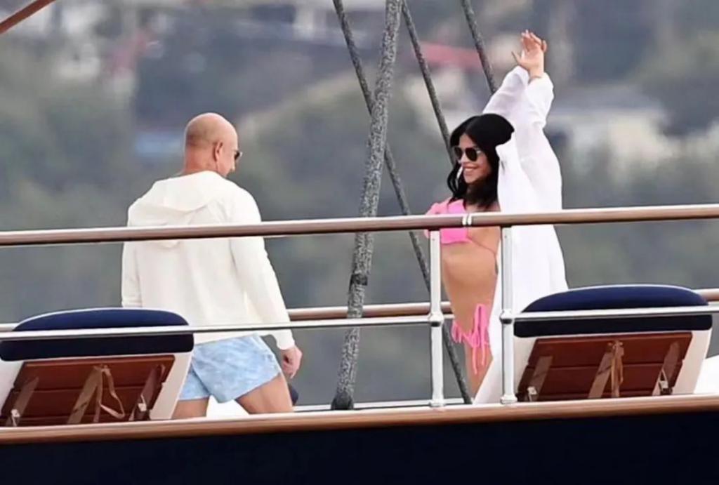 紧身花衬衣、心形墨镜,老富豪化身摇滚青年。年轻 5 岁的桑切斯带给老贝的新鲜感恐怕比很多年轻 20 岁的带给他的更多。