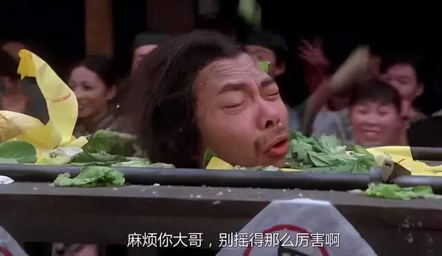 电影《少林足球》中,他饰演的大师兄,也有一个被老板用酒瓶子砸头的片段。