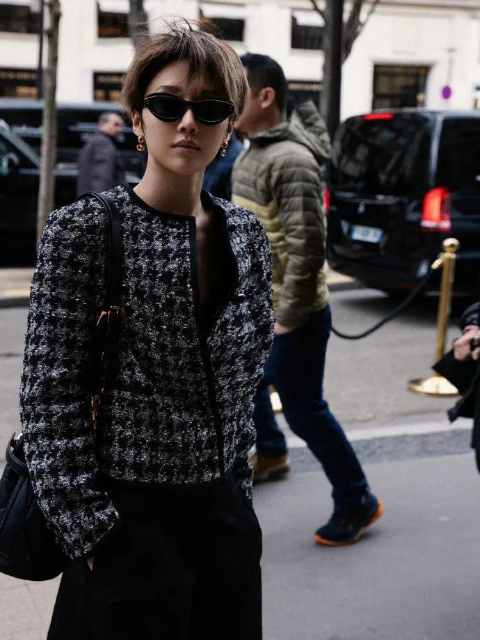 另一套千鸟格短款外套搭配阔腿裤,帅气和优雅融合得恰到好处。