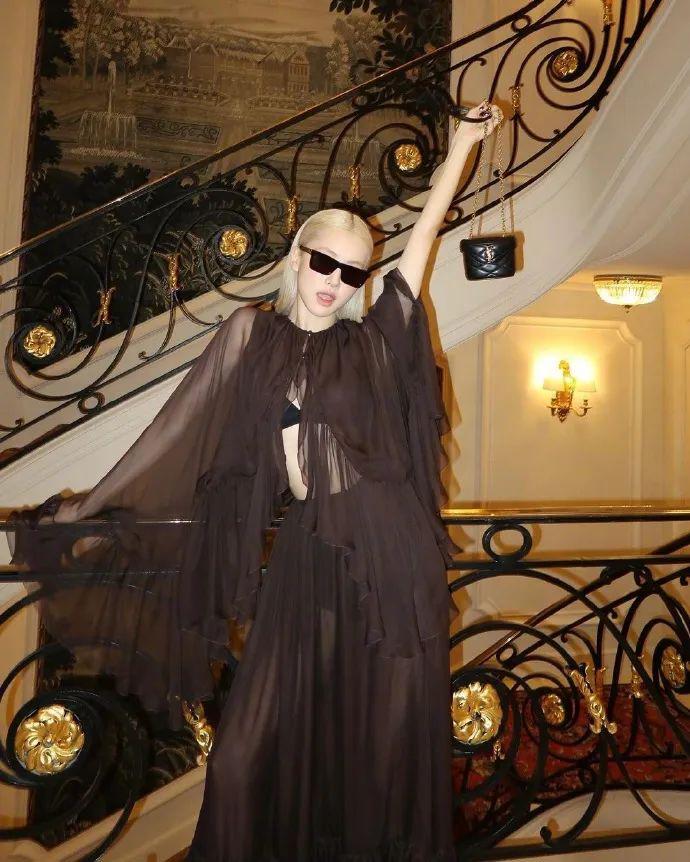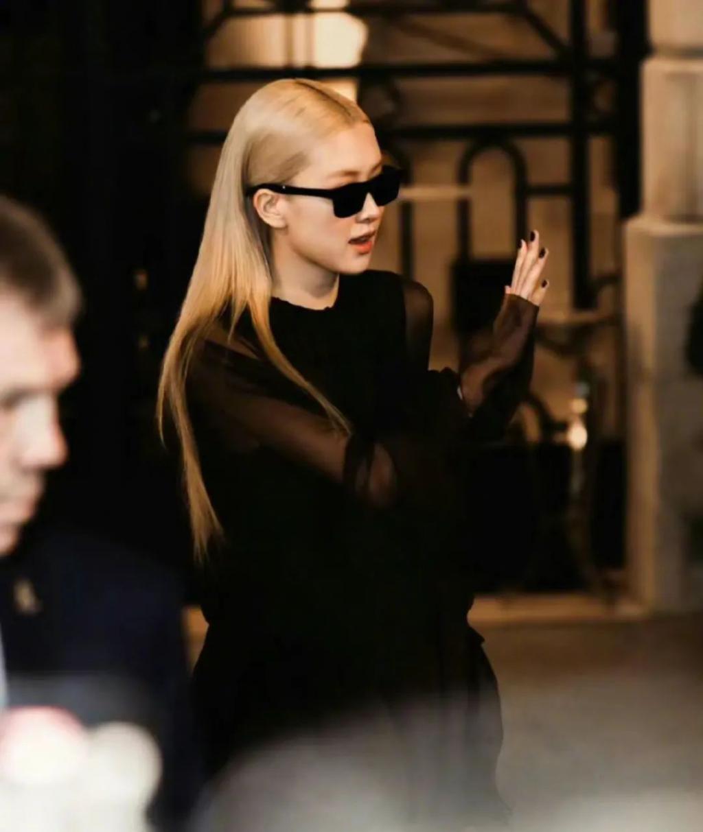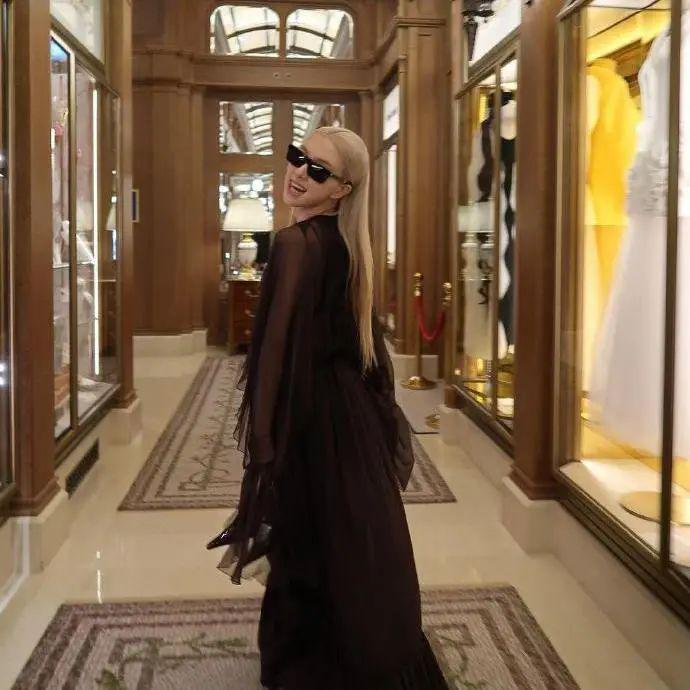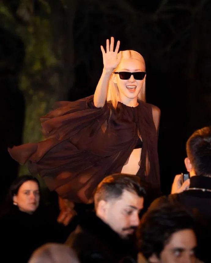一袭2024春夏系列的飘逸纱裙,金发梳得一丝不苟,搭配墨镜和尖头高跟鞋,让原本柔美飄逸又仙气感的造型增加了酷感和率性。
