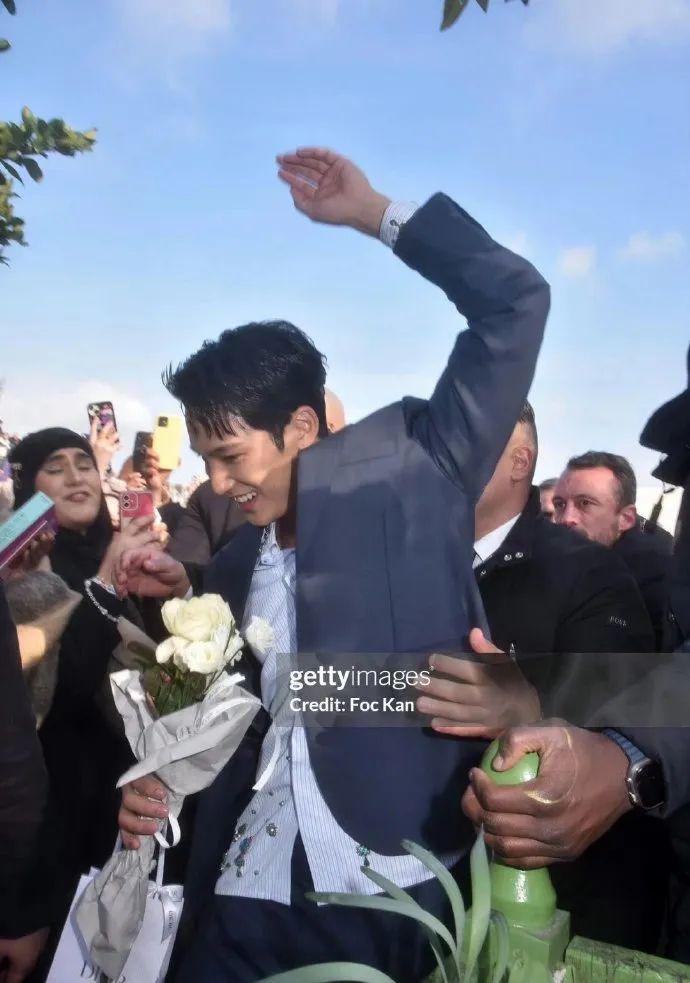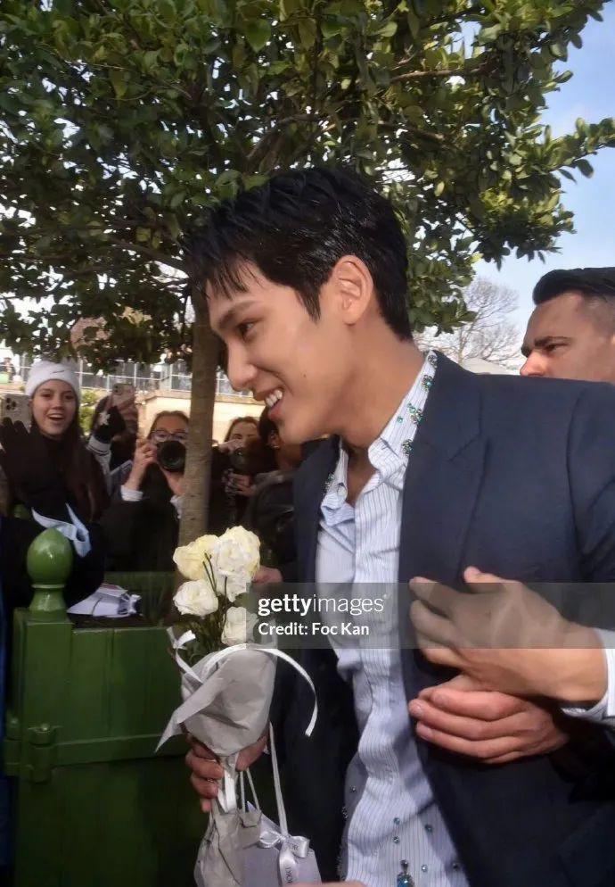 秀场外手拿白玫瑰,在G社的镜头下像是在接亲,铁塔、白玫瑰、飞吻、 热情的笑容、簇拥的人群......一切都是那么的恰当好处。