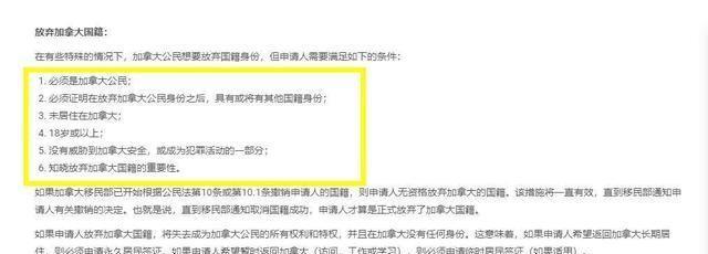 此外,放弃加拿大国籍的条件也是满坑的,表面上看也就六条,大体上说,只要符合18岁以上,没有威胁到加拿大的安全,也没有在加拿大居住,但是这些都是我们看到的内容,实际上还有一些隐含的要求,如果你放弃加拿大国籍,还要缴20%的弃税。