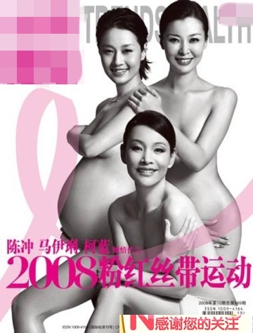 怀胎9月的马伊琍也步蒋勤勤后尘,和陈冲、柯蓝为《时尚健康》拍摄了一组全裸照片,展现女性的自信和美丽,同时传递关爱,号召大家为乳腺癌防治尽自己的力量。和蒋勤勤一样,大肚子的马伊琍成了大家关注的焦点。
