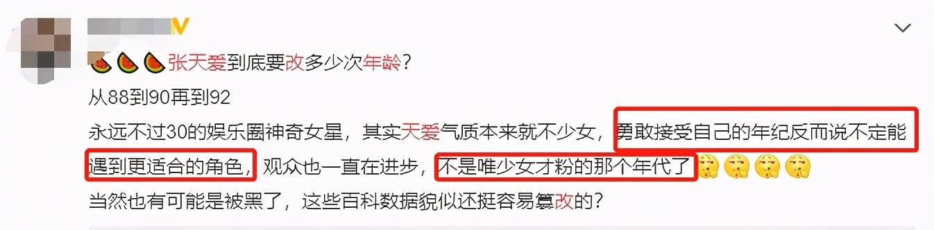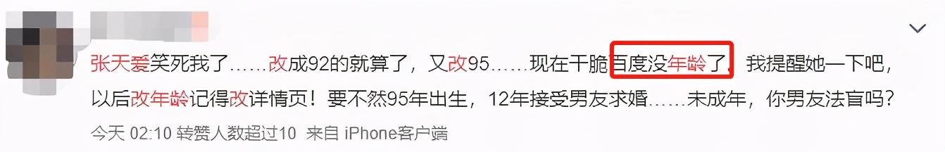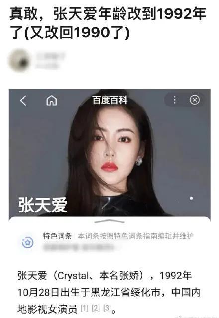 而张天爱的年龄被关注不是第一次了,之前她的资料在年龄这一栏就从88年出生变成了92年出生,最近有网友爆料,疑似又更改了年龄,而这次直接变成了95年生人,不得不说,这一波操作很是迷惑。而网友对她的年龄更改也记得十分清楚,更有人记得她老板曾经说过她是86年的。