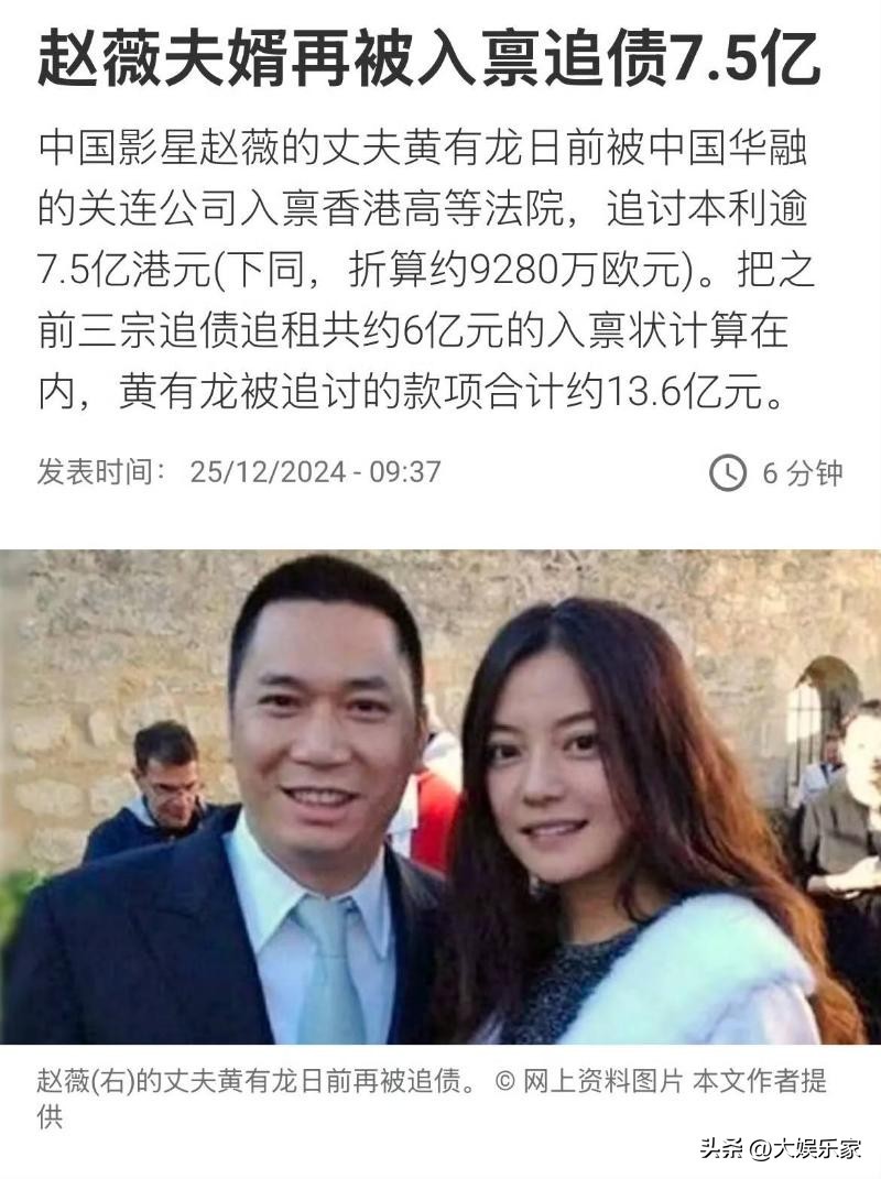 而在赵薇被封杀期间,黄有龙不时被爆出欠钱不还,近日又有新闻报道说黄有龙被追债7.5亿。