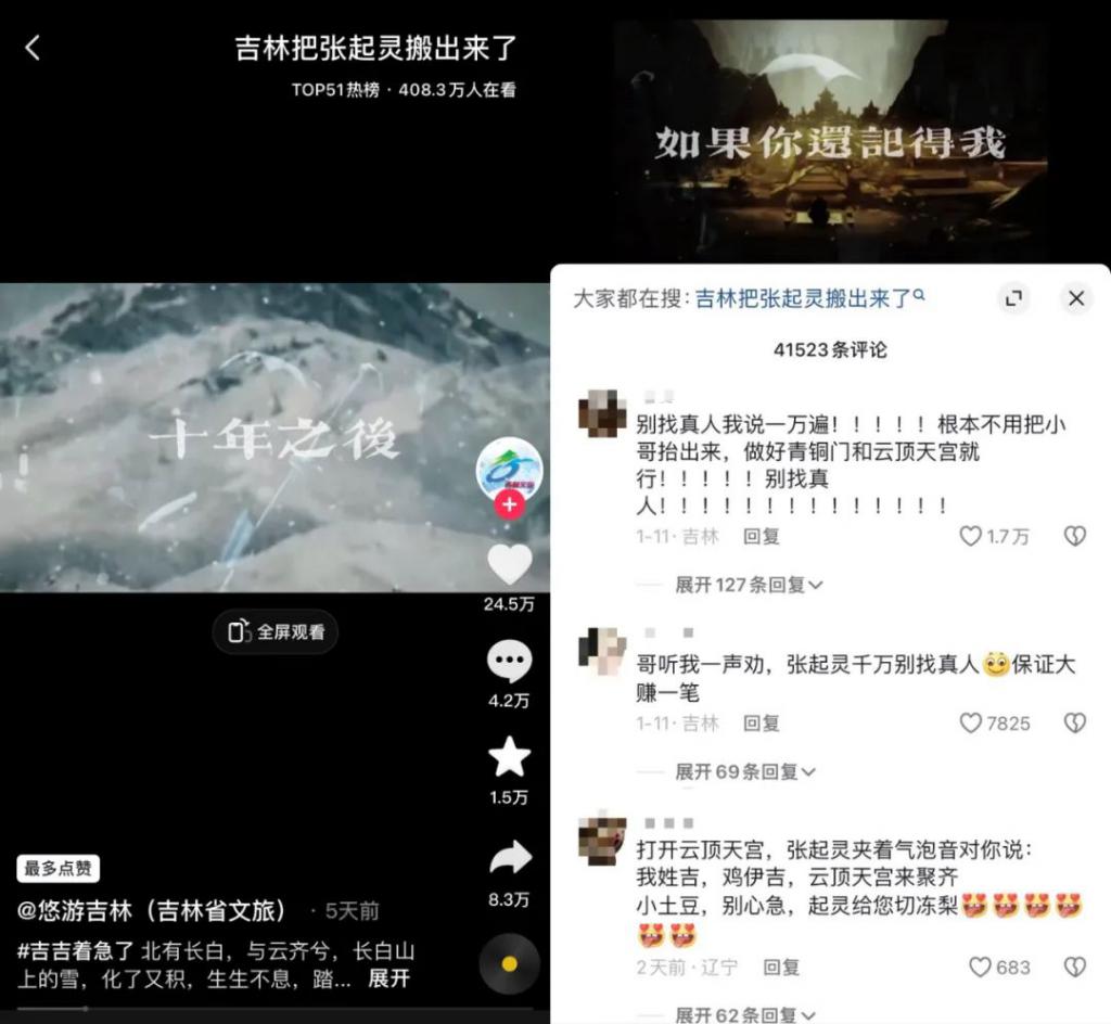 影视作品与文旅一直都属于互相成就,不过玩经典 IP 还需注意分寸,否则容易引发粉丝不满。在 # 吉林文旅把张起灵搬出来了 # 的热搜词条下,不少网友表示 " 搞个虚拟投影就好,别出真人 cos 求求了 "。