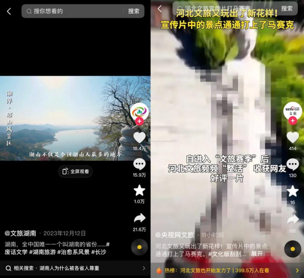 让我们看看战果,目前 @河南省文化与旅游厅抖音账号共计 1.2 万条作品,@河北文旅当前累计 3958 条作品,平均不到 1 小时更新一条作品。