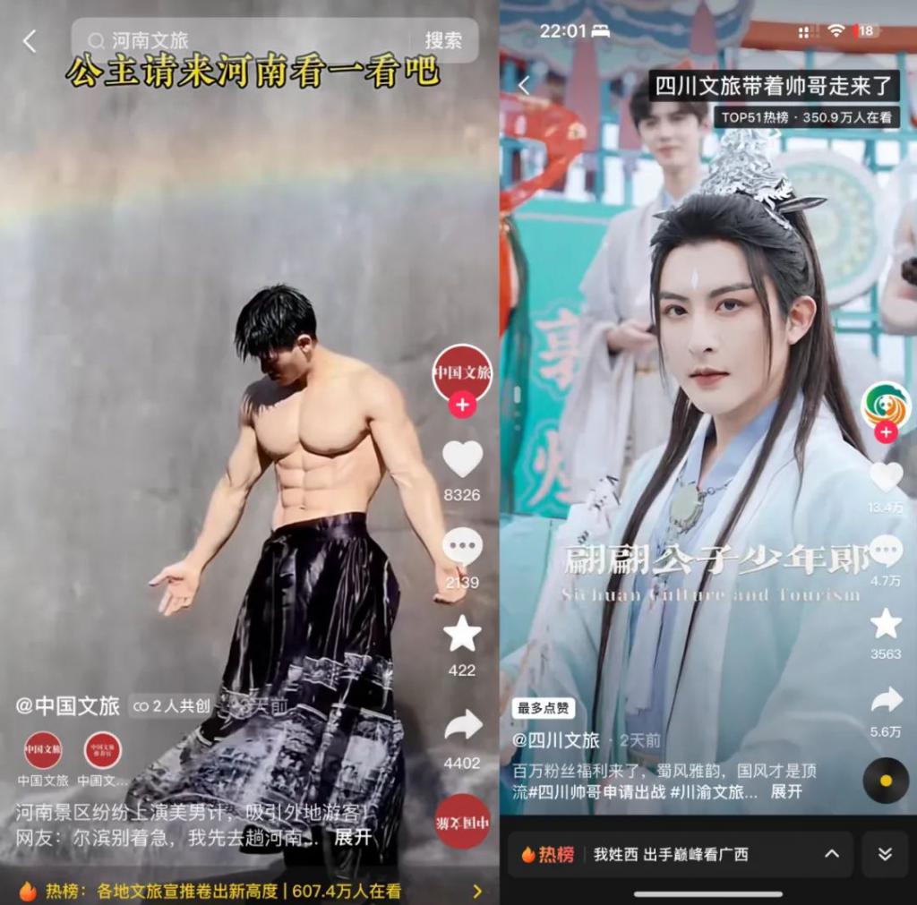 河南不仅在景区上演 " 美男计 ",还安排了汉服美女、西域美人、云台山妲己等古装美人,甚至洛阳等地还在高铁站、地铁站安排了 " 锦衣卫 ",喊出 " 恭迎公主殿下回城 " 的口号,平等地吸引每一位游客。随后,四川文旅也跟上了步伐,发布了帅哥拍摄的短片,# 四川文旅带着帅哥走来了 " 登上热榜。