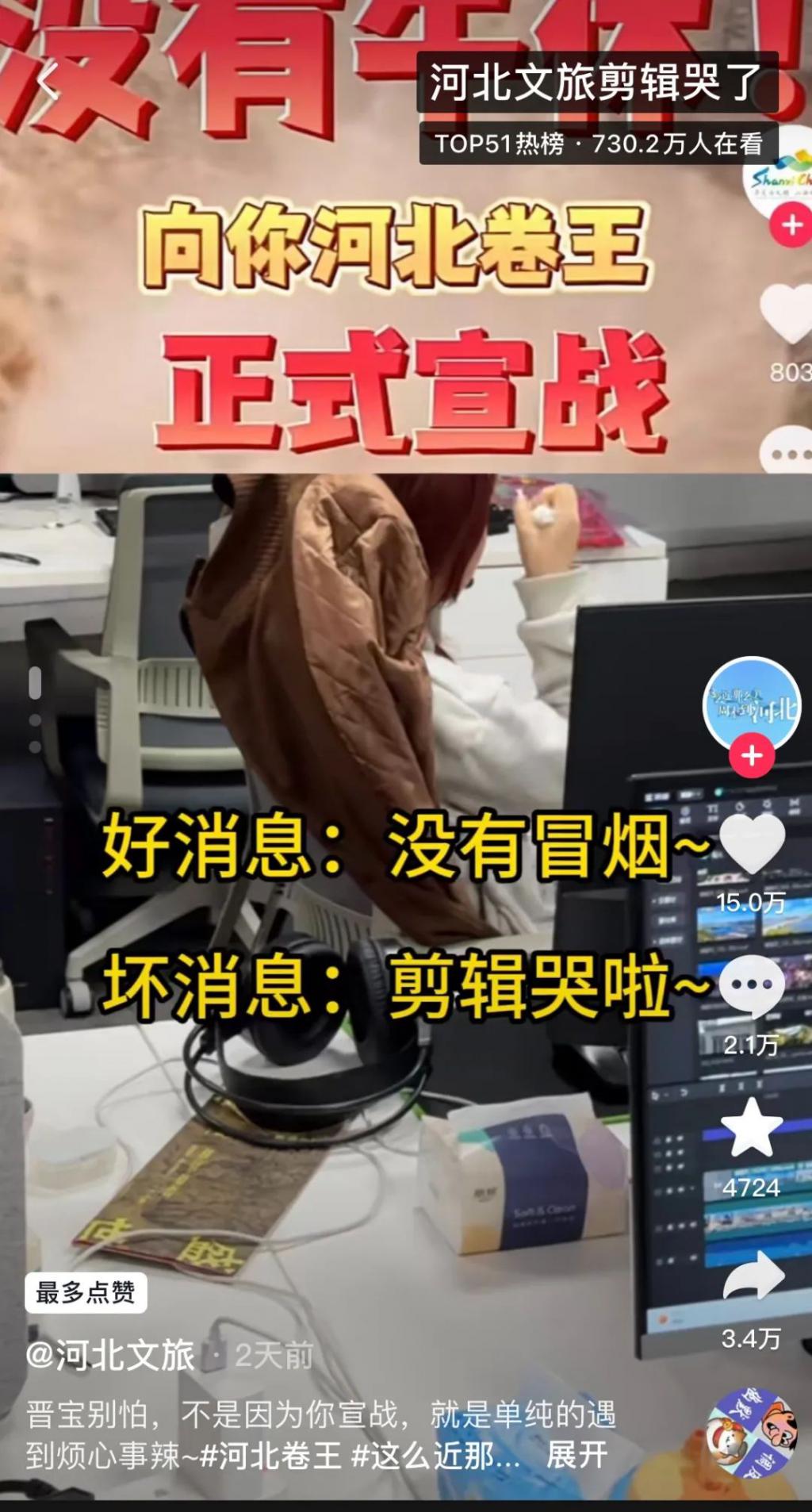 还有不少文旅局采用了题海战术,讲究的就是通过量变达到质变。河南文旅连续发了百条视频,凌晨还在奋战;河北文旅也是发挥出了 " 衡水精神 ",一天就怒发了 70 多条视频,陕西文旅也一口气发了 50 多条作品。连河北文旅剪辑小姐姐都卷哭了,真是将 " 卷 " 发挥到极致。