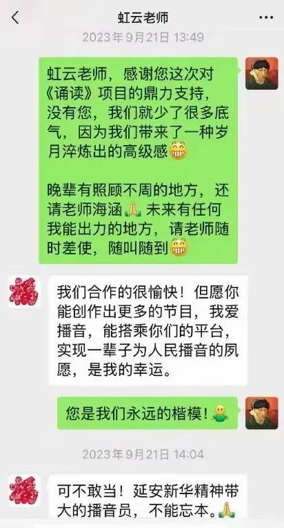 曾经和虹云老师合作过的同事们,也纷纷发文悼念。2023年筹备《诵读,你眼中的丰收》时,79岁高龄的虹云老师主动请缨。在筹备过程中,她虽然年事已高,但精神矍铄,拒绝别人的搀扶,也从不提及酬劳。她对每一位后辈都和蔼可亲,总是给予他们鼓励和支持。对待每一行文字,她都认真钻研,反复揣摩,力求将最完美的朗诵呈现给观众。她的敬业精神和对后辈的关爱,让每一个参与的人都深受感动。