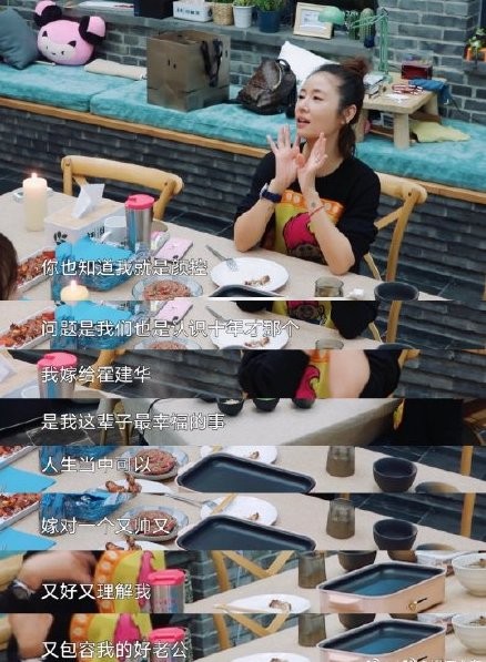 林心如以朋友的身份做客陈意涵家,陈意涵感叹了一句“霍建华真的好帅”时,林心如骄傲又故意做作地摆了一个pose说“你也知道我就是颜控”,还顺便内涵了一下陈意涵老公许富翔的颜值。而高情商的陈意涵立刻出声维护老公称自己嫁给许富翔很荣幸。林心如大赞好友会说话,表示自己也要学起来。于是她就立刻当着全国观众的面上演了“虐狗三连”,对着镜头公开对霍建华表白称嫁给霍建华是这辈子最幸福的事,大夸霍建华又帅人品又好脾气也好,又理解她又包容她。