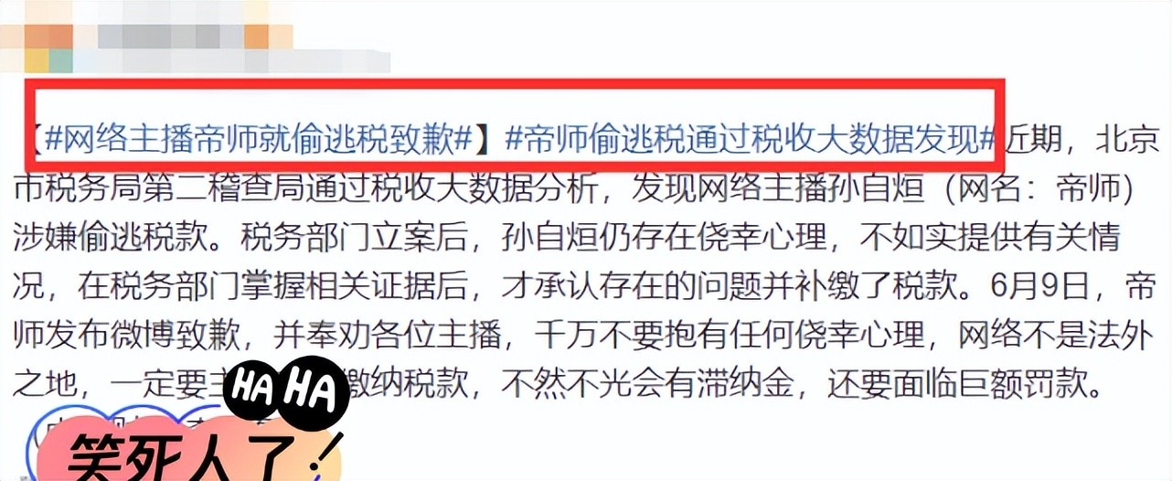 6月9日,网上又出了一则大新闻,知名主播孙自烜(网名:帝师)涉嫌偷逃税款,被罚款上千万,引发诸多网友的热议。