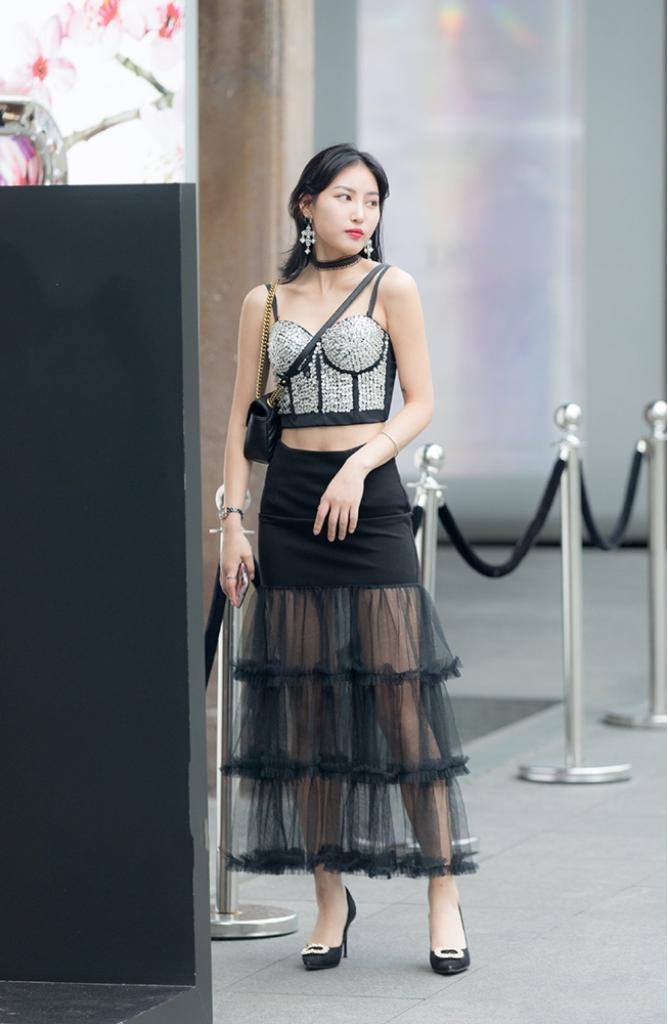 这位美女的小吊带设计就时尚潮流许多了,分为上下两部分。上身是一件露脐小吊带,小吊带上彩添加了blingbling的小钻石。在阳光的照耀下很是亮眼,而且小吊带的设计将女性的特点凸显了出来,非常的性感。下身是一件网纱长裙,看着这大长腿太让人羡慕了。