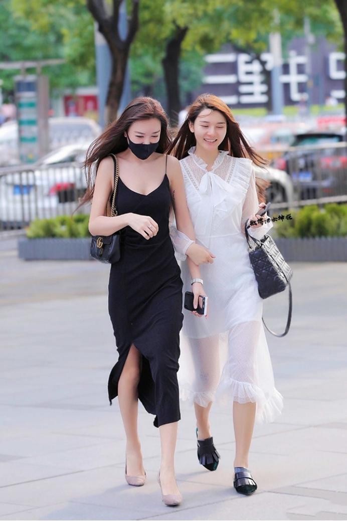 我们都很喜欢和闺蜜逛街,那么如何在穿搭上略胜一筹呢?看图中的两位小姐姐,是不是感觉穿黑色小吊带长裙的小姐姐看起来更加的有女人味呢,黑色的小吊带使小姐姐不错的事业线轻微展现,而收腰的设计和包臀设计更是将她的身材包裹的特别的性感,小小的开叉设计则突出了修长的大长腿,顿时感觉旁边的闺蜜黯然失色。