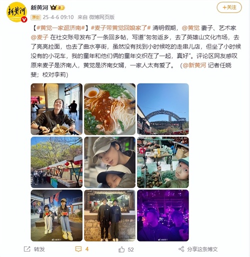 清明假期,知名演员黄觉妻子麦子在社交账号发布了一条回乡帖,写道“匆匆返乡,去了英雄山文化市场,去了亮亮拉面,也去了曲水亭街,虽然没有找到小时候吃的走串儿店,但坐了小时候没有的小花车,我的童年和他们俩的童年交织在了一起,真好”。