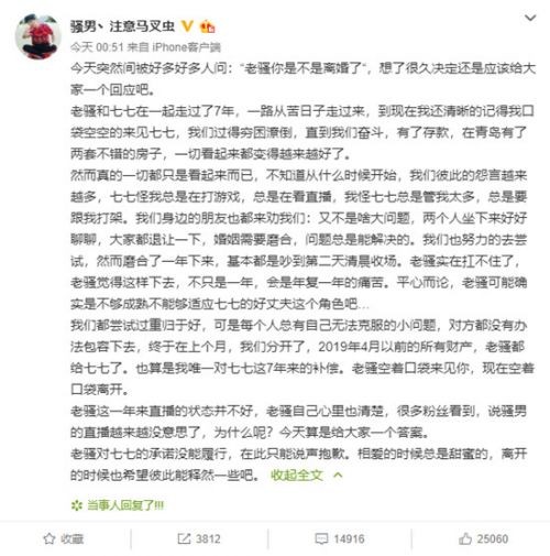 后面骚男也发布了相关的微博对于离婚这件事进行了相关的说明